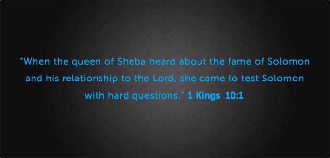 “When the queen of Sheba heard about the fame of Solomon and his relationship to the Lord, she came to test Solomon with hard questions.” 1 Kings 10:1