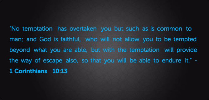 “No temptation has overtaken you but such as is common to man; and God is faithful, who will not allow you to be tempted beyond what you are able, but with the temptation will provide the way of escape also, so that you will be able to endure it.” – 1 Corinthians 10:13